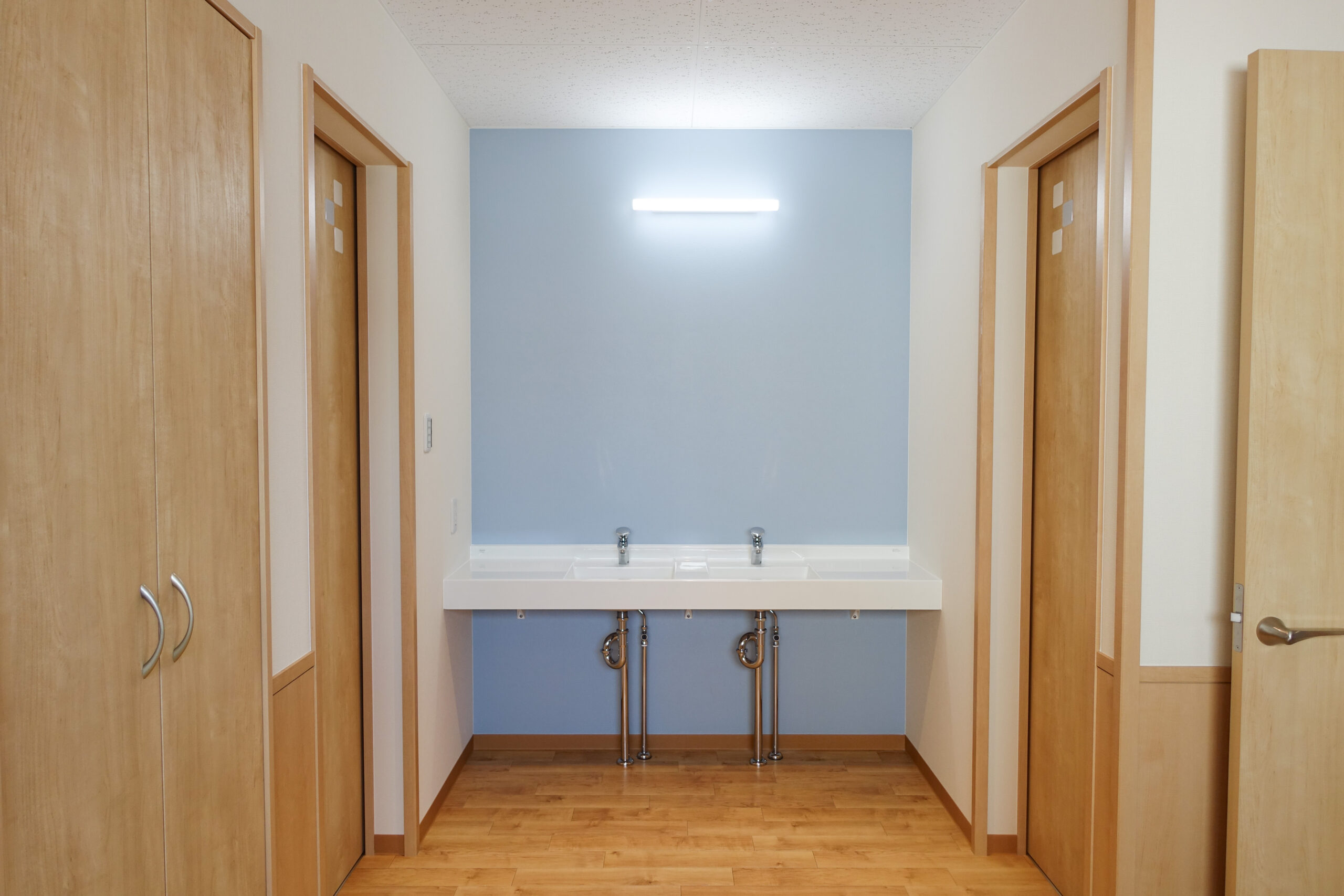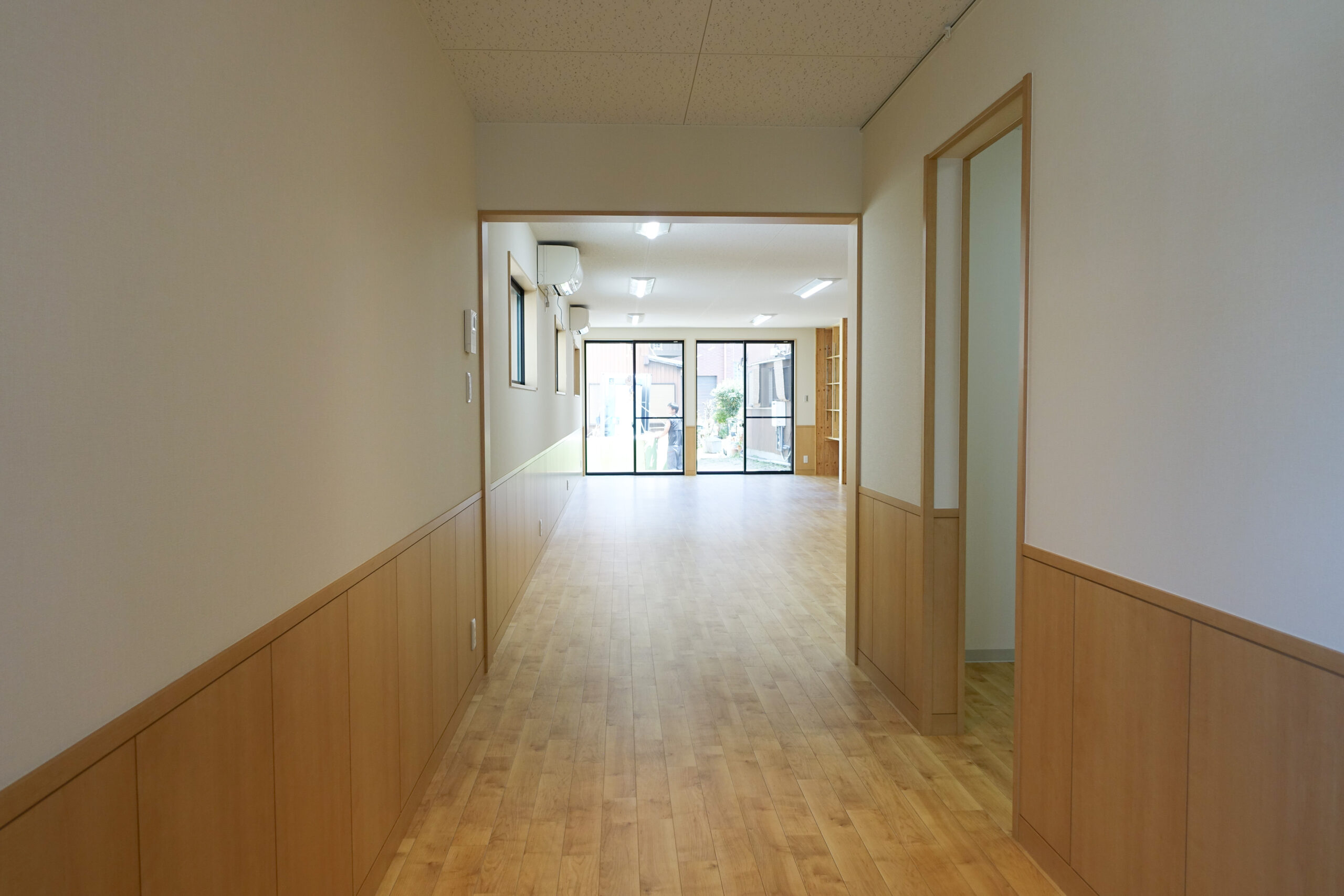 四日市市に建築させていただいた、細長い土地を生かした間取りの学童保育所です。各室にアクセントクロスを採用し、明るい雰囲気の内装となっています